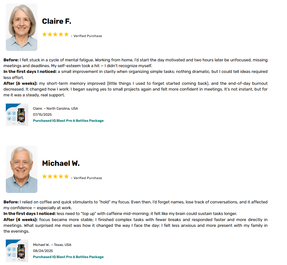 IQ Blast Pro combines premium ingredients, essential vitamins, and scientifically studied natural compounds, providing complete support for brain function, memory, attention, and emotional balance. Thousands of users have already experienced the transformation: sharper thinking, faster decisions, and higher productivity. Now it’s your turn to feel the difference.