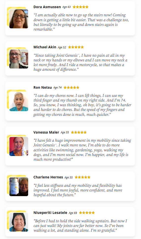 JointGenesis provides a truly transformative experience — not just temporary relief. Its benefits go beyond the physical, directly improving quality of life. By restoring natural joint lubrication and reducing inflammation, it brings back the freedom to move without pain, the joy of walking, exercising, and living freely. Many users report improved posture, greater energy, and renewed confidence to resume activities they once avoided.